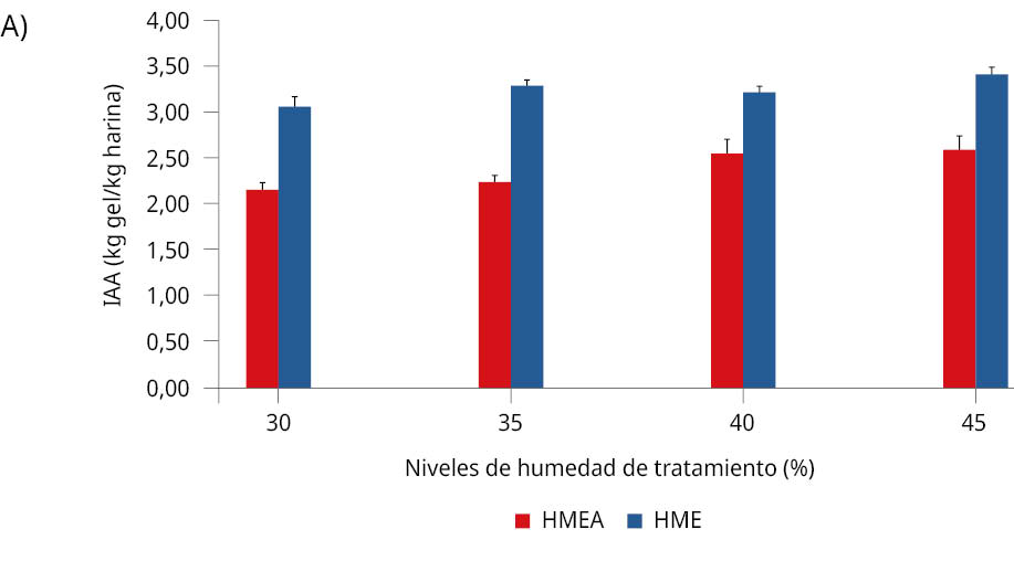 El objetivo de este trabajo fue estudiar las propiedades tecnofuncionales de la harina de maíz cuzco extrudida alcalina (HMEA), obtenida por el agregado de Ca(OH)2 en el proceso de extrusión, y compararla con las de una harina de maíz obtenida por un proceso de extrusión tradicional (HME). La harina nativa se acondicionó a humedades de 30, 35, 40 y 45% (p/p) y fue extrudida en un extrusor monotornillo a 80 °C. Para la extrusión alcalina
