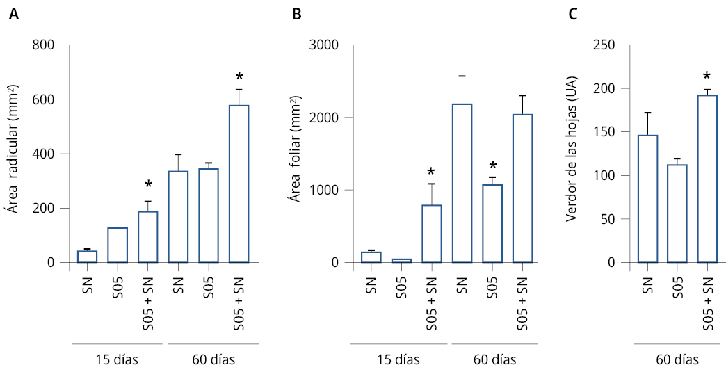 Es conocida la capacidad de algunos microorganismos de estimular el crecimiento y desarrollo de las plantas. Sin embargo, el uso de levaduras de la industria cervecera como agentes promotores del crecimiento de plantas (PGPM) ha sido brevemente estudiado. El objetivo de este trabajo fue caracterizar y analizar el uso de la levadura residual de la fabricación de cerveza artesanal en cultivos hidropónicos. Se evaluó el efecto de la adición de dicha levadura en el crecimiento y desarrollo de Arabidopsis thaliana, Eruca vesicaria y Lactuca sativa en almácigo y en sistemas hidropónicos. Se observó un aumento significativo en el largo de la raíz principal luego del tratamiento con las suspensiones de levadura en A. thaliana y E. vesicaria crecidas en almácigos (SN 4.28 ± 0.15, S05 7.30 ± 0.29; SN 39.68 ± 2.20, S05 57.37 ± 2.80, respectivamente). En sistemas hidropónicos de raíz flotante, la inoculación de levadura a la solución hidropónica incrementó un 30% el área radicular de L. sativa en relación con el control. Se concluye que la inoculación de S. cerevisiae cepa J14 aislada del residuo de la elaboración de cerveza, sola o incorporada a la solución nutritiva de sistemas hidropónicos, podría ser una herramienta biotecnológica como bioestimulante y/o promotor del crecimiento vegetal.