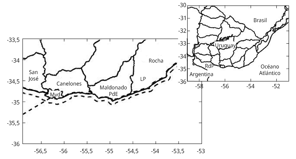 Ortega, L. y Martínez, A., 2007. Multiannual and seasonal variability of water masses and fronts over the Uruguayan shelf. En: Journal of Coastal Research, 23(3), pp.618-629. DOI: https://doi.org/10.2112/04-0221.1