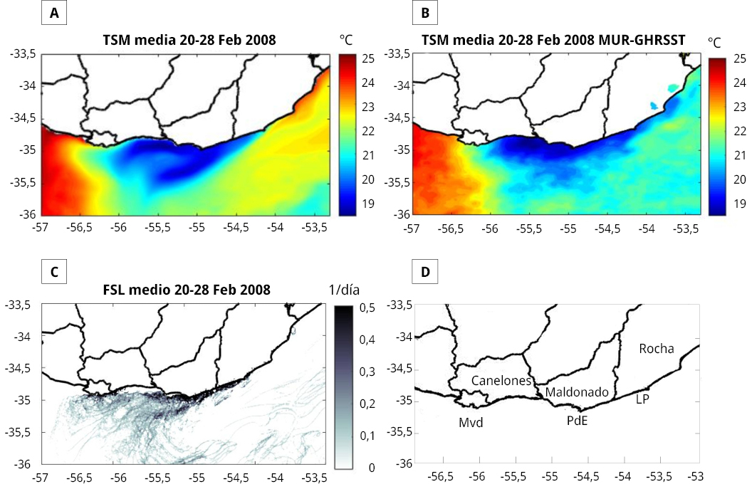 de Mello, C., Barreiro, M., Ortega, L., Trinchin, R. y Manta, G., 2022. Coastal upwelling along the Uruguayan coast: Structure, variability and drivers. En: Journal of Marine Systems, 230, 103735. DOI: https://doi.org/10.1016/j.jmarsys.2022.103735