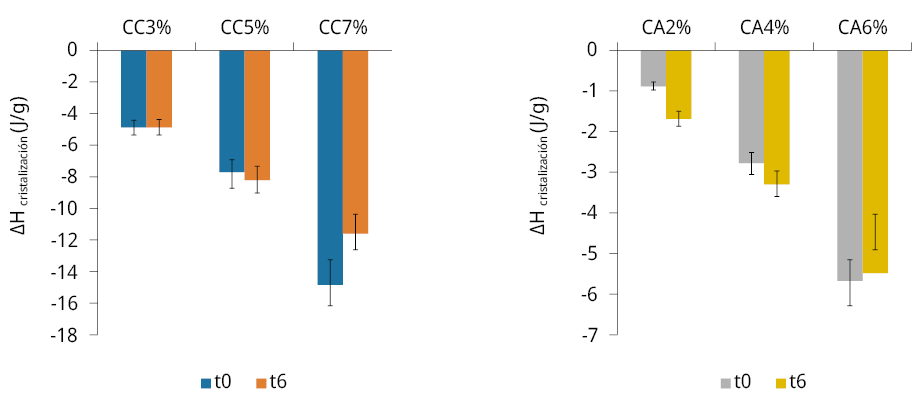 Los oleogeles son especialmente importantes ya que pueden ser empleados como reemplazo de materiales grasos para uso alimentario, aunque su utilización queda condicionada por su vida útil. En este marco, se estudiaron las propiedades térmicas de los oleogeles de aceite de girasol común (AG) con ceras de abeja (CA) y de carnauba (CC) como estructurantes, a distintas concentraciones, por calorimetría diferencial de barrido, y el deterioro oxidativo a temperatura ambiente en función del tiempo de almacenamiento. De acuerdo con los termogramas de fusión de los oleogeles, el aumento de la concentración de estructurante provocó un incremento en las temperaturas de pico. Los rangos asociados a la temperatura de desestructuración variaron entre 26.3 y 60.8 °C, y, 35.9 y 86.1 °C, mientras que las entalpías correspondientes variaron desde 1.5 a 6.5 J/g y 3.3 a 13.3 J/g para las ceras CA y CC, respectivamente. Los resultados de los parámetros asociados al deterioro oxidativo de los oleogeles con CC fueron los más elevados. Ello indica que los oleogeles con CA tienen una mayor resistencia a la oxidación y, por ende, mayor estabilidad oxidativa. En conclusión, los oleogeles estudiados solo podrían ser utilizados en alimentos con una vida útil menor a 6 meses.
