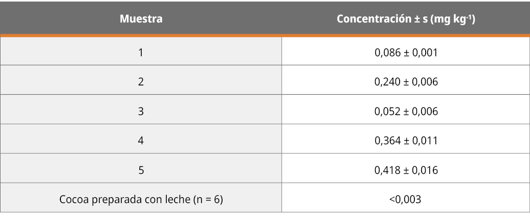 Existe una creciente preocupación respecto al contenido de cadmio (Cd) en los productos derivados del cacao, como la cocoa en polvo; lo que ha llevado al establecimiento de valores de ingesta máxima tolerable de este metal y a la disminución de los niveles máximos (NM) aceptados. En este sentido, es necesario realizar un control sobre los niveles de Cd en estos alimentos, contando con métodos analíticos confiables y amigables con el medio ambiente. Con ese objetivo se desarrolló y validó un método analítico para la determinación de Cd en cocoas puras y en su preparación con leche, la forma de consumo más popular en nuestro país. El método resultó adecuado para el fin definido y presentó como ventaja un menor consumo de ácidos concentrados que el método de referencia de la AOAC International (2016b). Se aplicó para un sondeo del contenido de Cd en muestras disponibles en el mercado local de Montevideo, Uruguay. Si bien todas las muestras tuvieron concentraciones detectables de Cd, resultaron inferiores al NM establecido.