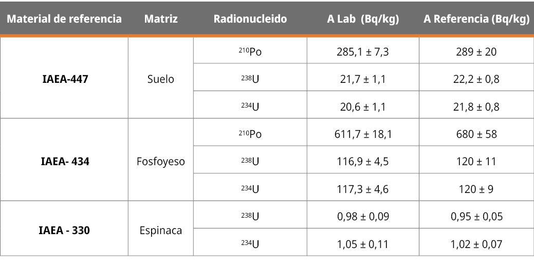 La roca fosfórica, materia prima utilizada para producir fertilizantes, puede ser fuente de metales, radionucleidos y otras trazas debido a su composición. La aplicación de fertilizantes fosfatados puede redistribuir y elevar las concentraciones tanto de metales como de radionucleidos en los perfiles del suelo y en aguas, influyendo en su disponibilidad y posterior transferencia a la cadena alimentaria. Conocer la proporción de dicha transferencia es fundamental por las implicaciones que puede tener sobre la salud humana y animal. Este trabajo estudia las condiciones de tratamiento de muestra, separación radioquímica y deposición o electrodeposición para la cuantificación de polonio-210, uranio-238 y uranio-234 por espectrometría alfa para un sistema agrícola uruguayo. Ambos procesos requieren optimización para cada tipo de matriz a fin de evitar el efecto de autoabsorción, así como posibles interferencias de otros radionucleidos presentes en la muestra. El método fue verificado mediante la cuantificación de polonio-210, uranio-238 y uranio-234 en materiales de referencia del Organismo Internacional de Energía Atómica (IAEA): suelo IAEA-447, fosfoyeso IAEA-434, espinaca IAEA-330. Los radionucleidos fueron cuantificados en matrices ambientales y los resultados se compararon con los obtenidos por Espectrometría de Masas con Plasma Acoplado Inductivamente (ICP-MS), mostrando resultados comparables e indicando que la separación radioquímica desarrollada es adecuada para la determinación de los radionucleidos de uranio y polonio por espectrometría alfa en las matrices estudiadas.