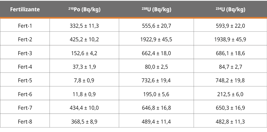 Dutra Garcêz, R. W.; Marques Lopes, J.; Frota Lima, M. A. y Xavier da Silva, A., 2018. Determination of Ra-226, Ra-228 and K-40 specific activities in samples of mineral fertilizers marketed in the city of Rio de Janeiro, Brazil. En: Applied Radiation and Isotopes, 141, pp. 199-202. DOI: https://doi.org/10.1016/j.apradiso.2018.04.013
