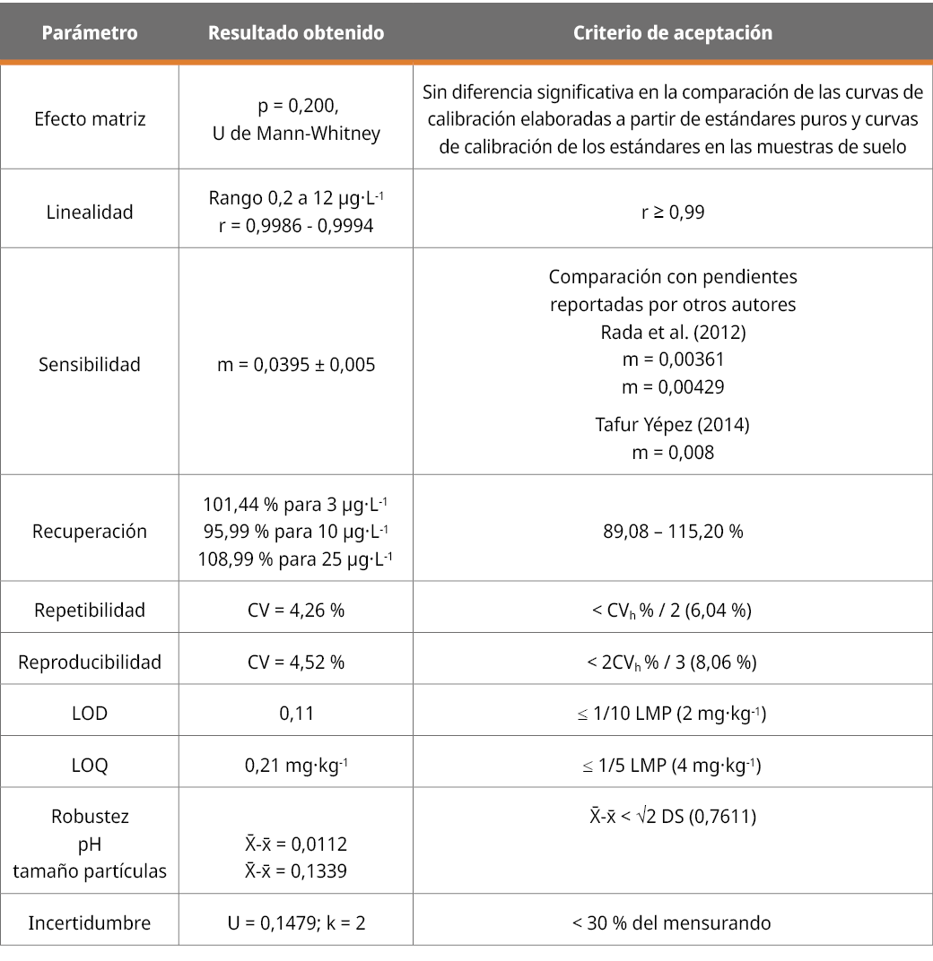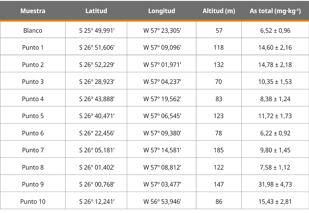 En Paraguay, la investigación sobre la contaminación por arsénico (As) es aún incipiente. El objetivo del presente estudio fue validar un método analítico para la determinación de arsénico total en muestras de suelo por espectrofotometría de absorción atómica con generación de hidruros (EAA-GH). Para la validación se colectó una muestra blanco de un área de nula actividad antropogénica y, para su aplicación, diez muestras de la cuenca del río Tebicuary. El sistema de muestreo fue combinado por cuadrícula. Las muestras fueron secadas, tamizadas, homogeneizadas y digeridas mediante digestión asistida por microondas. La determinación se realizó por EAA-GH. Se evaluaron parámetros de desempeño analítico como selectividad, linealidad, sensibilidad, exactitud, LOD, LOQ, robustez, incertidumbre y aplicabilidad. El método aplicado fue selectivo para As total y cumplió con los criterios de aceptación; linealidad 0,2 a 12 µg·L-1 (r > 0,99), sensibilidad (m = 0,0395 ± 0,005), exactitud y precisión (%R > 95 %), repetibilidad (CV = 4,26 %), reproducibilidad (CV = 4,52 %), LOD (0,11 mg·kg-1) y LOQ (0,21 mg·kg-1). El método fue robusto ante variaciones de pH y tamaño de las partículas. De diez muestras analizadas, una tuvo concentración de As total superior a 20 mg·kg-1.