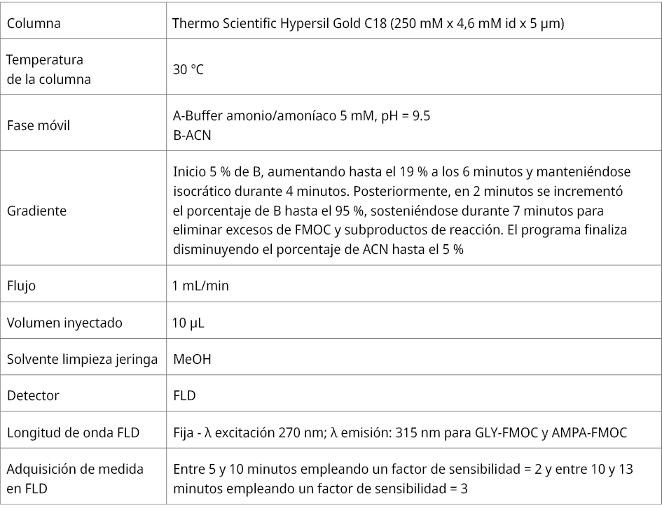 Alonso, B.; Griffero, L.; Bentos, H.; Pareja, L. y Pérez, P., 2022. Determination of glyphosate and AMPA in freshwater and soil from agroecosystems by 9-fluorenylmethoxycarbonyl chloride derivatization and liquid chromatography-fluorescence detection and tandem mass spectrometry. En: MethodsX, 9, pp. 1-12. DOI: https://doi.org/10.1016/j.mex.2022.101730