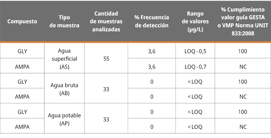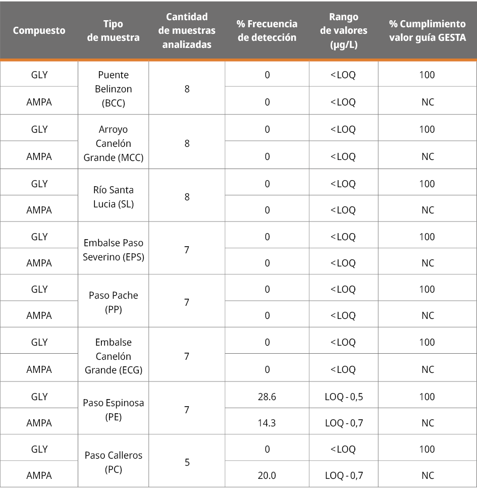 La cuenca del Río Santa Lucía (CRSL) es la principal fuente de abastecimiento de agua potable para la población de Uruguay y en ella existe un importante uso del herbicida glifosato (GLY). El objetivo de este trabajo fue realizar un monitoreo preliminar de GLY y su metabolito ácido aminometilfosfónico (AMPA) en aguas superficiales de la cuenca (AS), en agua bruta (AB) y en agua potable (AP) de la planta potabilizadora de Aguas Corrientes (PPAC). Se analizó GLY y AMPA en 121 muestras tomadas en el período de agosto a diciembre de 2020, 33 fueron AB de la PPAC, 33 de AP y 55 de AS de la CRSL. Se encontró que, en AB y AP, GLY y AMPA dieron resultados no cuantificables y cumplen con las recomendaciones y regulaciones nacionales respectivamente. En AS se detectaron y cuantificaron GLY y AMPA en la subcuenca del arroyo Canelón Chico con valores inferiores a 1 µg/L. Estos valores cumplen con las recomendaciones nacionales para aguas naturales, no así con las regulaciones de la Unión Europea. Por otra parte, este hallazgo indica que la subcuenca del arroyo Canelón Chico es uno de los afluentes de menor calidad de la CRSL.