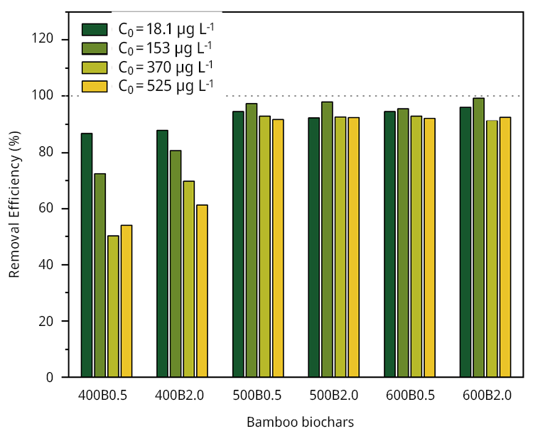 Es fundamental desarrollar adsorbentes sostenibles y rentables para eliminar la microcistina-LR (MCLR). Se pirolizó Bambusa Tuldoides a varias temperaturas (400, 500 y 600 °C) y tiempos de residencia (0,5 y 2 h) para producir una serie de biochares. La capacidad de adsorción de MCLR observada (219 μg g-1 para una muestra de 600B0.5) en condiciones de pH similares a las de una planta de tratamiento de agua (pH = 7.6) se atribuye principalmente a las interacciones hidrofóbicas, el apilamiento π-π y la naturaleza básica de los biochares (pHpzc > 8). Un análisis exhaustivo, que incluye FTIR, análisis elemental y próximo, TG, SEM, adsorción de N2, porosimetría de Hg y espectroscopia Raman, respalda este hallazgo. Además, para comparar el 600B0.5 con un carbón activado disponible comercialmente, se realizó un estudio dinámico utilizando agua contaminada real. La muestra 600B0.5 exhibe una eficiencia de eliminación del 99,5 %, lo que da como resultado una concentración final de 0.28 μg L-1, muy por debajo del valor de referencia de la Organización Mundial de la Salud de 1 μg L-1.